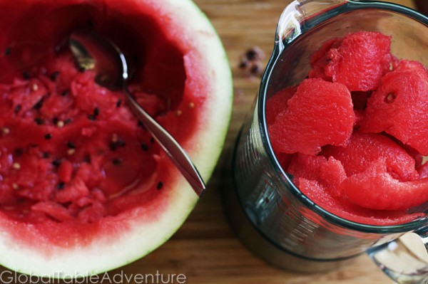 Not to worry. Blend the watermelon up, seeds and all. You’re looking for about 3.5 cups of puree.