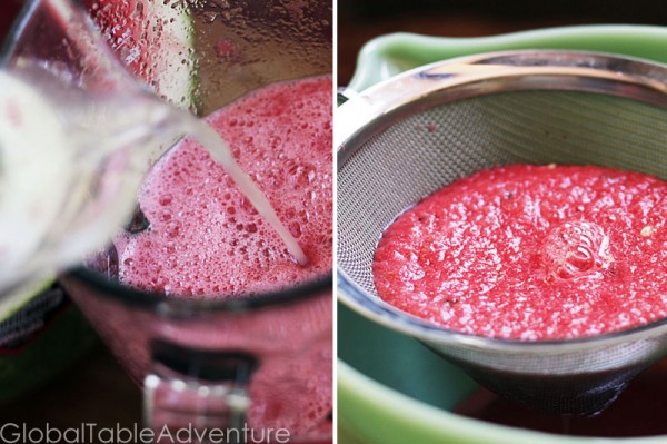 2. Scoop watermelon into a blender and blend. Then splash in the unstrained lemon juice and strain all together.