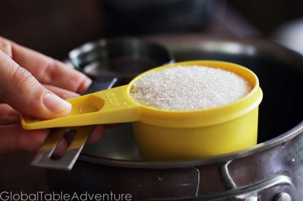3. Meanwhile, heat up the water and sugar in a small saucepan. You may like more or less sugar—depending on how sweet the watermelon is. Simmer gently until the sugar dissolves. Pour into the strained watermelon mixture.