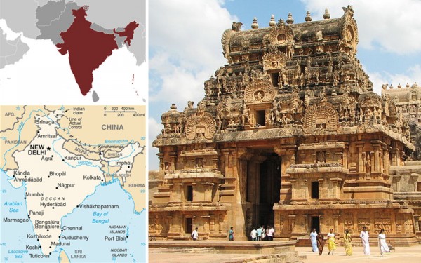 Maps courtesy of CIA World Factbook | Brihadeeswarar Temple. Photo by Bernard Gagnon