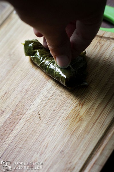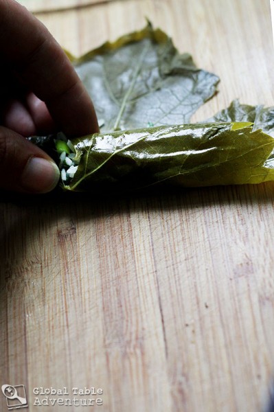 - Now all you need to do is wiggle those stubborn grape leaves out of the jar and begin wrapping them up. To do so, place leaf backside up and place a small spoonful of filling by the stem end. Begin to roll the leaf from the stem end. After about one roll, fold the left and right sides in. Continue rolling. You don’t need to make them super tight because the rice needs room to expand as it absorbs the liquid.