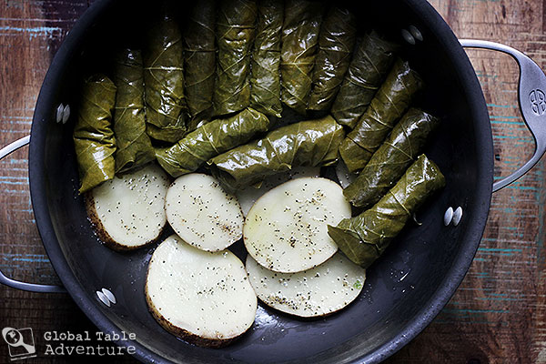 - Add potato slices to bottom of pot. Then add the grape leaves. Stack them tightly together, making one neat layer on top of another. Keep rolling and rolling.