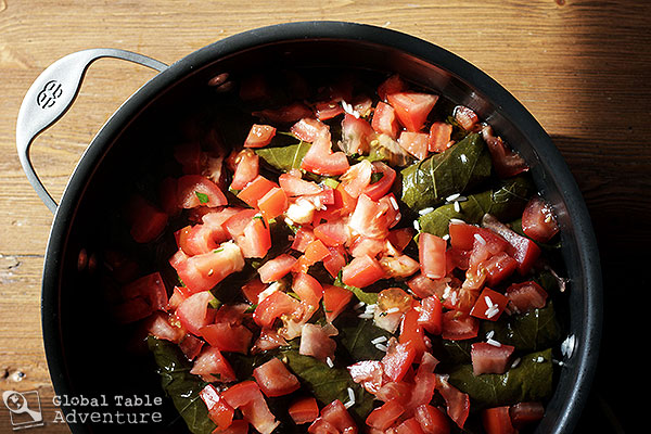 - Next, top with tomato slices. Pour on the olive oil and any juices at the bottom of the bowl that held the rice. Cover with a plate to keep the grape leaves from floating and unrolling, then top off with a lid. Simmer gently for about one hour. This will allow the potatoes at the bottom of the pot to get a nice crust. Then add the lemon juice and cook an additional hour (or to taste)... you’re looking for the rice to be tender inside of the grape leaves… (cut one open to check). I've seen several recipes cook them for upwards of three hours, so don’t despair if yours needs longer.