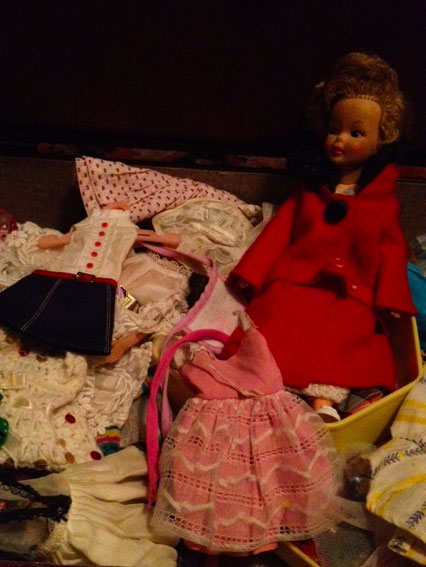 Sometime later, while scouring the rich neighborhoods for any good “finds” (a habit of my mom’s which never ceased to make me cringe) we happened upon a trunk full of someone’s old dolls placed on the curb, just waiting for someone to claim them. I remember ducking down so no one could see me.