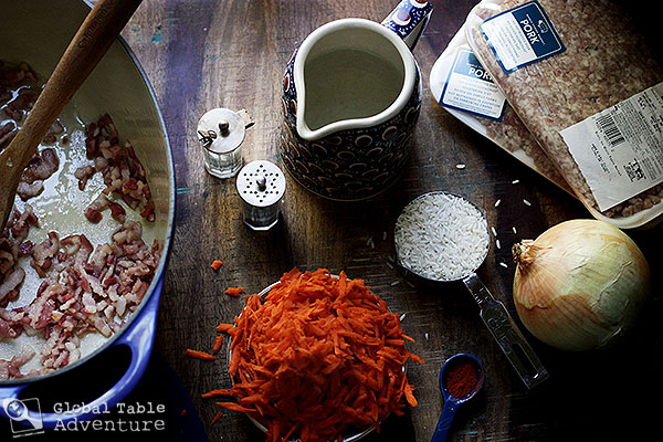 - In the same pot you’ll cook the Sarmale in, fry up the bacon to render the fat, but not to brown it. This very act makes any house smell like a home. A place I, for one, want to be. Next, dump in the chopped onion, grated carrot, paprika, salt and pepper. Cook until everything is happy and soft. Then stir in the rice and water. Simmer about 10 minutes or until the water is absorbed, stirring occasionally.