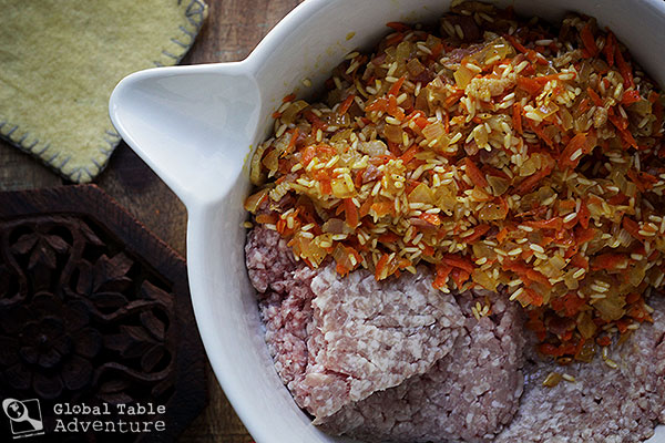 Combine the meat and the rice mixture in a large bowl (If you aren’t cooking these right away, you’ll want to cool the rice mixture before combining it with the raw meat).