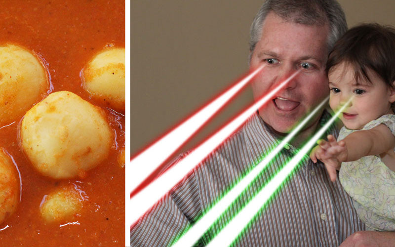 Perhaps when we shared the spicy potatoes from Bangladesh… in which Keith demonstrated (demonstrated?) his obsession with “laser eyes.”
