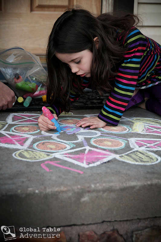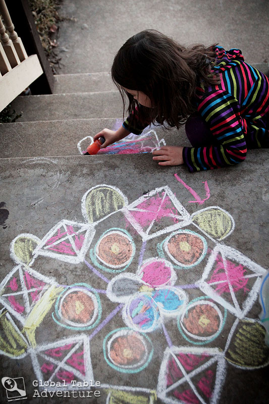 The idea is to welcome the dawn of spring with  chalk art in front of your home. Traditionally the “chalk” would be made of a paste from last year’s rice grains. In the morning, the sunlight falls on the drawings – a harbinger of good things.