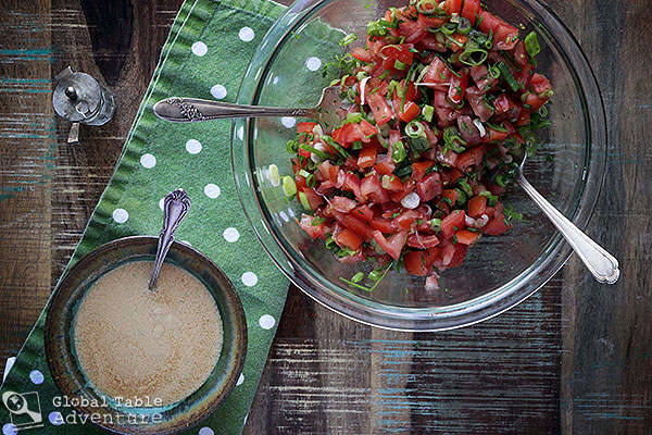 The South Sudanese love a good, chopped tomato salad on the side of their meals. Often, it’s no more than tomato, onion, and hot, green chili peppers… perhaps a spot of parsley… But other times, a bit of peanut butter and lime juice makes for a grand dressing… and tastes just like home, if you happen to be from South Sudan. When I was deciding which of the two recipes to try, the choice was clear: if peanut butter is involved, the answer is yes. Most definitely, yes. You can make this vegan recipe as spicy as you’d like by adding more (or less) chili peppers. I thought two Thai birds made a nice, mild/medium heat (bordering on hot if someone bit directly into a piece of pepper). For little ones, you can always leave the chili peppers out. In the end, the lime juice makes the salad tangy and bright, while the peanuts give it that African flair. I call a recipe like this, all kinds of wonderful. And so does Ava. Inspired by this …