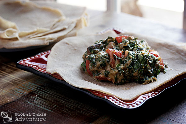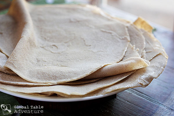 I never thought I’d need a cow’s brain and a credit card for this lil’ ol’ Global Table Adventure of ours. The thing is, if I were to make Kisra in the most authentic way – the South Sudanese way – that’s exactly what I’d need. Locals would use the cow’s brain, which is naturally quite fatty, to grease the pan. I got the tip on good authority; from this amazing South Sudanese food post on Green Shakes in Sudan. There you’ll find photos of local women rubbing brain renderings on their flat griddle-like pan. According to The World Cookbook for Students, unroasted sesame oil works fine as well… and gives the wholesome crepe a clean sort of flavor and makes them entirely vegan. I know what I chose…. what would you choose? Now, let’s talk credit cards. I read several passages that indicate locals spread out the kisra batter with credit cards. I had a small plastic scraper that worked just fine… but the credit card would definitely add a touch of excitement (will it or …