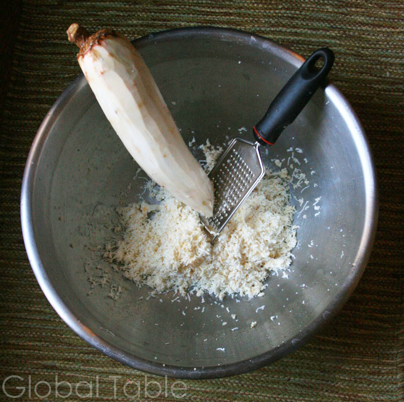 This week at the Global Table we’re eating like Angolans, lovers of hot and spicy food. I’ve never cooked with Habanero peppers, so I am eager for this challenge. Hopefully I don’t burn our mouths off! Camarao Grelhado Piri Piri (Grilled Prawns with peppers) [Recipe] Marinated Prawns in garlic, green onions, cumin, and habanero peppers Muamba de Galinha (Chicken Stew) [Recipe] Chicken seared in red palm oil, then stewed with pumpkin, okra, onion, tomatoes, and habaneros Baton de Manioc/Chikwangue (Cassava Sticks) [Recipe] Cassava (also known as Yuca) is soaked in water for 3 days, then ground into a paste and steamed in banana leaves. Cocada Angolana (Coconut Dessert) [Recipe] Use fresh coconut to make this pudding-like dessert.