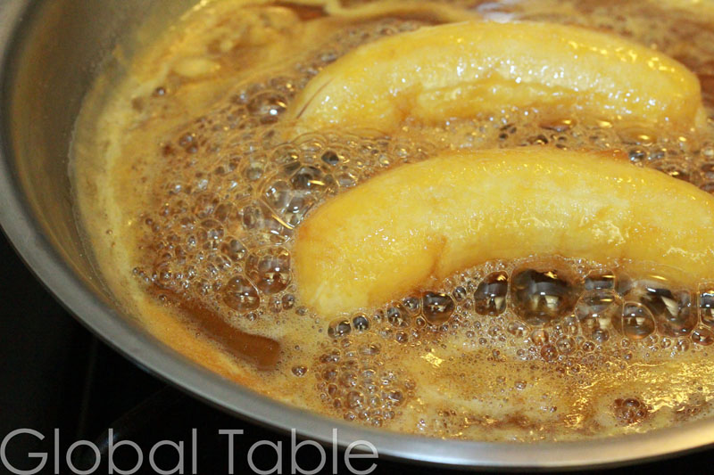 Serves 2 Bananas in orange sauce is a fresh, summery way to use bananas as a dessert topping. When we made the Baked Brown Sugar Bananas for Antigua and Barbuda (made with brown sugar, rum and butter) I didn’t think they could be beat, but these west African bananas are totally different and just as yummy!! Ingredients: 1/2 cup orange juice 1/2 cup brown sugar 1 Tbsp lemon juice (optional) 2 slightly under-ripe bananas NOTE: We used red bananas which are about 4 inches long, you can also use baby bananas or regular bananas. Method: 1. Heat orange juice, brown sugar, and lemon juice in a skillet for about 15 minutes on low (there should be small bubbles breaking the surface, but not quite a simmer). The orange juice will reduce and thicken into a syrup. 2. Peel bananas and add to syrup. Cook for a few minutes per side, making sure to warm through. 3. Serve immediately with ice cream, pound cake, or plain. Baby Bananas in Orange Sauce Votes: 0 Rating: 0 You: …