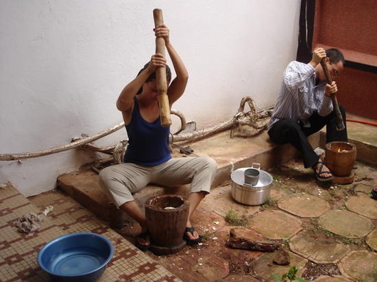 Because there is a shortage of information on Benin, I had to dig really deep to find some fun facts. In my search I happened upon a lovely blog by a young woman named Jen. Jen is an American who spent 2 years in Benin for the Peace Corps. I enjoyed reading through her experiences (although I am sad to report that they end mid-trip, suddenly and without explanation). First, I want to share a picture I found of her cooking class in Benin. You will see the lengths Jen and the other students are going to to get the food mashed and ready to eat. Makes you appreciate blenders, food processors, immersion blenders, and power gadgets in general. AND it makes me not feel so bad for having to peel 1,000,000 beans the other day. Upon reading some more of Jen’s blog, I learned that food service is typically very slow (in this entry she was visiting an area called Grand Po Po). In fact, some restaurants take 1-2 hours to prepare the food. Why, you …