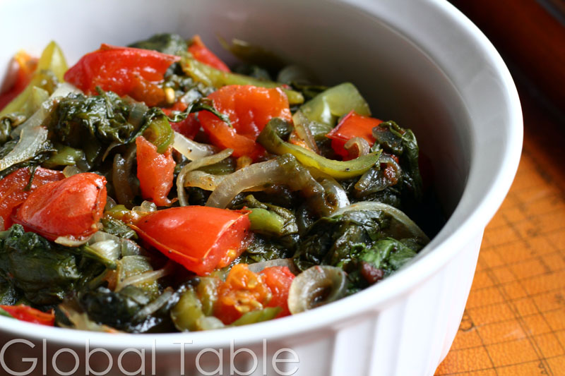 Serves 2-4 I love this easy, no-nonsense, super healthy side dish from Botswana. Simply steam spinach in its own juices until all the vegetables are soft. If you’d like to leave the tomatoes a little firmer, add them half way through cooking. Ingredients: 1 lb baby spinach 1 large onion, sliced thinly 2 tomatoes, chopped 1 green pepper, sliced thinly oil salt pepper Method: 1. Add all ingredients to a large skillet or wok. Cover and heat over medium-low, stirring occasionally. Cook for about 30 minutes, or until all vegetables are soft. Serve hot. The thinner the onion, the quicker it will cook and become tender. Look how pretty – you can see the knife through the onion! 🙂 ‘ Bostwanan Stewed Spinach Greens Votes: 0 Rating: 0 You: Rate this recipe! Print Recipe I love this easy, no-nonsense, super healthy side dish from Botswana. Simply steam spinach in its own juices until all the vegetables are soft. If you’d like to leave the tomatoes a little firmer, add them half way through cooking. CourseSides …