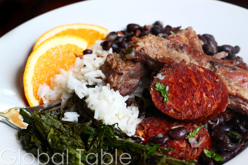 Feijoada is Brazil’s stew of choice for lazy Saturdays and potluck Sundays. At it’s absolute best, Feijoada is a massive pool of black beans piled high with a glorious assortment of meat. One plateful will provide enough slow-burning energy for a marathon, although you won’t be able to run after eating it! This is definitely a meal for elastic pants. Originally, Feijoada was made with pig ears, tails, and feet. Today, this hearty dish is typically made with dried beef (carne seca) and pork meats – usually sausages, like paio, and ribs. According to my Brazilian classmate from high school, “cow tongue is also super popular (and yummy).” Like chili in the USA or Beef Bourguignon in France, there are as many recipes as there are mammas (and papas) cooking. Serve Feijoada with farofa (manioc flour pan-toasted in butter), sweet orange slices, and white rice. Sauteed kale is a popular side dish too. Although this green is bitter, you’ll be glad you made it because feijoada sends diners begging for veggies to balance out the beans …