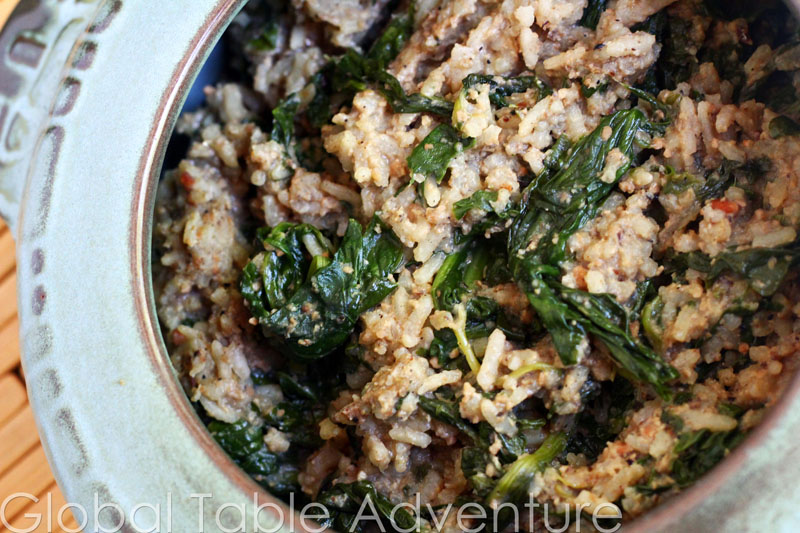 Burkina Faso is a dizzying landscape of dusty red plains and grassy savannas, broken up by stunning rock formations that tower above the ground. The culinary landscape of Burkina Faso is similar – plain, sparse even – with the occasional burst of unexpected flavor. Let me explain. Most meals are centered around pieces of Tô, a firm ball of white starch made with millet, sorghum, or corn. These bland balls are wonderfully adaptive because they take on the flavor the broths, soups, and stews that they are dipped into, often tomato or peanut based. This is every day fare – the turkey sandwich of Burkina Faso. And, just like our sandwiches, Tô is eaten by hand. This simple meal routine is broken up with rice, cous cous, or even maize. Here’s where the burst of unexpected flavor comes in. A blend of bitter greens, such as spinach, kale, or even mild cabbage, can be cooked with the grains to make a complete dish called Babenda (recipe). What makes Babenda interesting are the fermented locust beans (called …