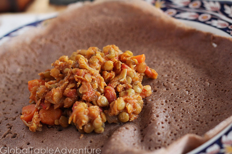 Do you dream of cleaning out your cluttered silverware drawer? Are you totally tired of your dishes? Try a happy bite of Injera, the gorgeous Teff flatbread adored in Eritrea, Ethopia, and other East African countries. Sour and funky… Injera is almost as thin as a crepe, but spongy like a pancake … and is traditionally used both as a platter for spicy stews and to replace silverware. Three tips for foolproof Injera making: 1. Consistency Make sure the batter is almost the consistency of crêpe batter (between crêpes and pancakes) . Any thinner and the bubbles won’t form. Much thicker and it won’t look like traditional Injera. Practice makes perfect. 2. The Pan If you don’t have the traditional mitad (I didn’t), you can use a large, short sided pan. You’ll have the best luck with a nonstick pan or a really well seasoned crêpe pan. Cover loosely with aluminum foil if it doesn’t have a lid. 3. Play it cool Absolutely cool the Injera before stacking or attempting to move it around much. They are …
