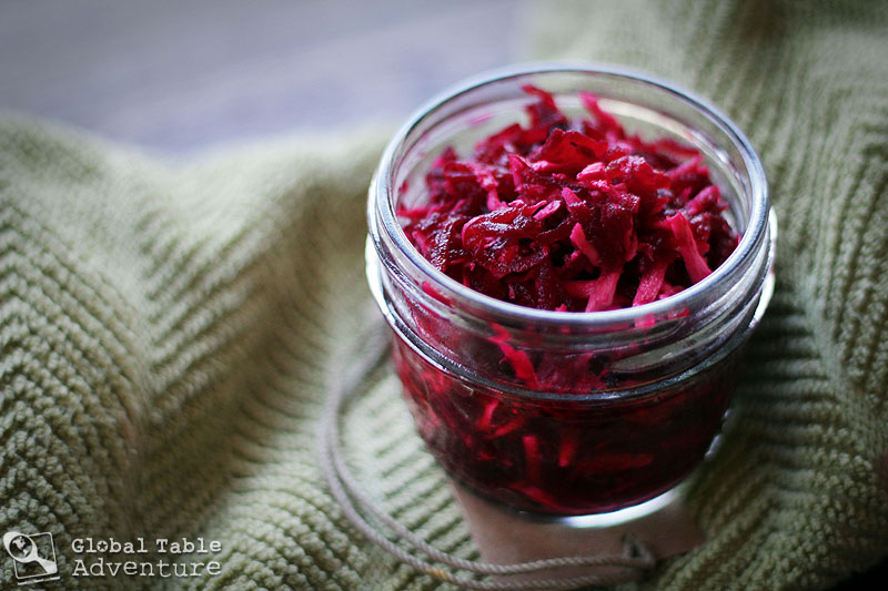 It may have happened when you were five. Or maybe, just maybe, not until today. Either way, this much I know for sure: there comes a time in every person’s life when they come face to face with the mighty beet. Some will cower or run away, while others – like the Lithuanians, will chow down with enthusiasm. In this traditional slaw, roasted beets blend with tear-inducing horseradish and vinegar…creating a spicy, sour accompaniment that goes particularly well with beef and fish. P.S. Start this recipe a day or two before you need it, to give the ingredients time to mingle. Ingredients: 3/4 lb beet(s) (or 1- 1 1/2 cup(s) roasted, grated beets) 1 cup grated horseradish (about 1 whole horseradish, peeled & grated) 1/2 cup white wine vinegar 1/2 cup water 10 peppercorns, cracked or coarse ground pepper sugar, to taste salt Method: While this recipe will work with any old red beet, it’s always better to find the most GIANT beet in the world. Look how this one dwarfts my loaf pan… it’s …