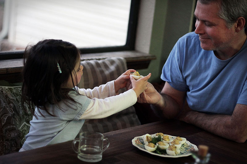 THE SCENE: We start off with twelve Lithuanian deviled eggs, more than enough for two adults and a toddler. We each eat one. Mine is gone in 2.8 seconds. Ava takes a minute to nibble on hers. Keith, a.k.a. Mr Picky, barely makes it. He shudders a little and holds his nose while he eats his egg, all in one bite because he simply can’t bare to make it last any longer. This is serious work for him; hard-boiled eggs and mushrooms are two of his least favorite ingredients. Watching him struggle, I can’t help myself. I giggle uncontrollably. The more I feel bad for him, the funnier it gets. He looks at me as he chews. I see payback in his eyes. A twinge of fear runs through me. “They taste a lot better than they smell,” he says. Curious if he means it, I ask him to eat one more. We debate. He begs. I beg. Ava watches us pingball the idea around. She offers him one. Finally, he eats one more, purely for her …