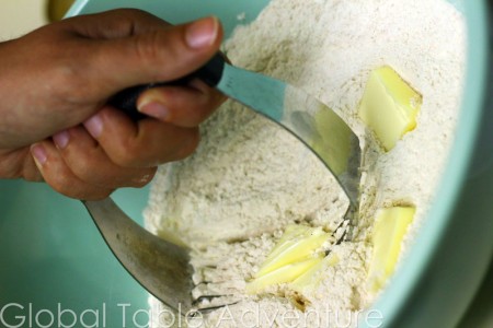 2. Cut butter into the flour with a pastry cutter until pea-sized.