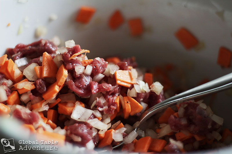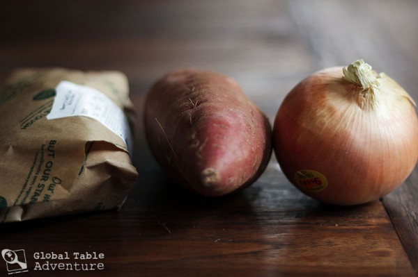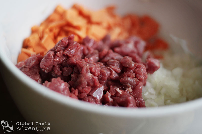 Meanwhile, prepare the filling. Like most meals in Kyrgyzstan, this recipe does not use a lot of ingredients. There are three main stars in our filling: lamb, sweet potato and onion. That’s it.