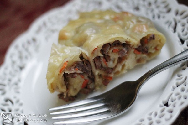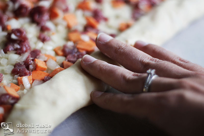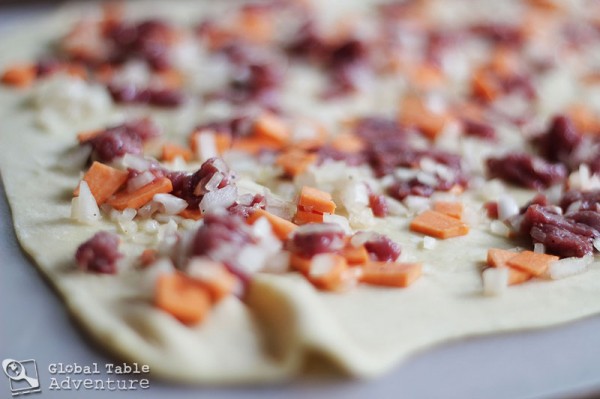 Truth: anything coiled up is infinitely better than the same item not coiled. Think cinnamon rolls… princess Leia’s hair… really flexible kitty cats napping… and now, as never seen in my kitchen before Global Table Adventure, Oromo. This Kyrgyz dish of rolled and coiled pasta filled with various stuffings is pure genius. Unlike Italian stuffed pastas, no cheese is used as binder. Instead the filling is commonly meat and veggies (such as sweet potatoes or pumpkin). While it remains a decidedly simple recipe, some southern regions of Kyrgyzstan are said to add herbs to their fillings.