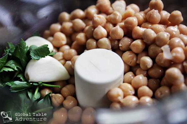 Put the chickpeas, parsley, garlic, lemon juice, tahini, salt, and olive oil in a food processor. Phew. I remembered the garlic.