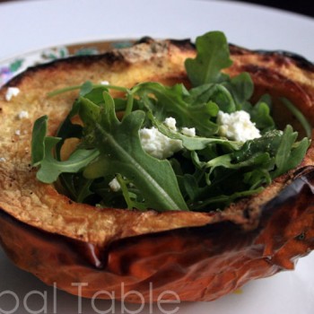 5. Transfer roasted pumpkin to serving plates. While still steaming, fill the cavities with crumbles of goat cheese and then baby arugula. Add vinaigrette to taste and toss, being sure to scrape pumpkin flesh into salad as you toss. Eat immediately.