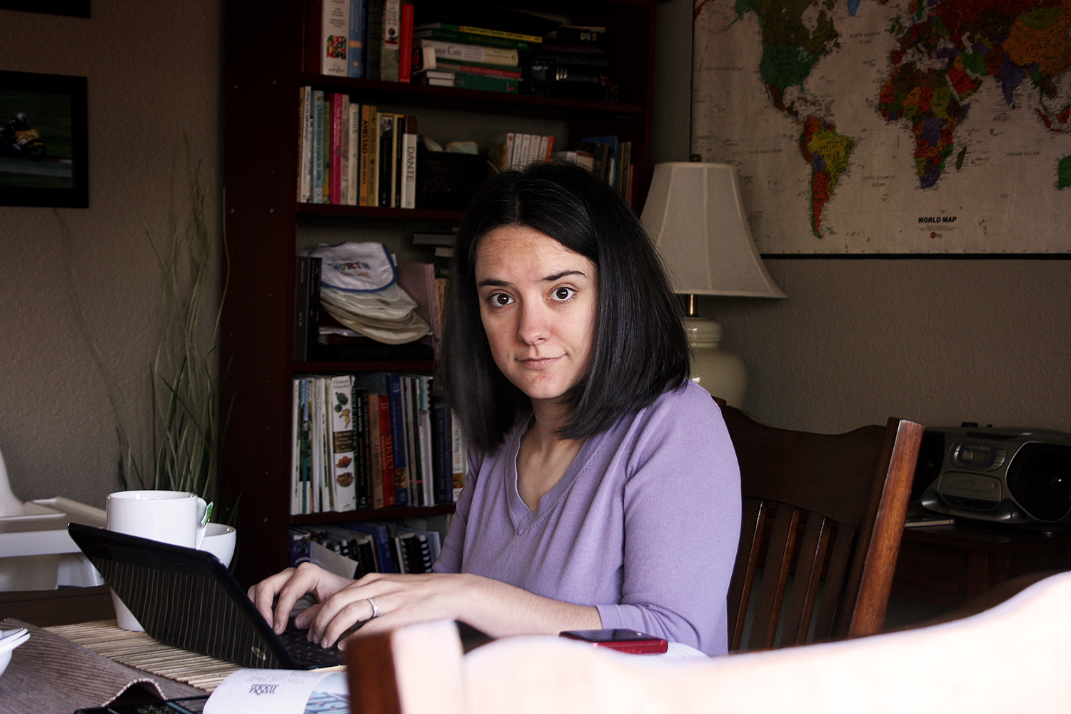 Keith snapped me researching Andorra, surrounded by books, map, and a pile of bibs (on the bookcase).