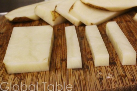 Very few people have specialty equipment in their homes for cutting French fries. If you are lucky, you just might have a mandoline. I prefer to cut fries by hand because it gives me more control. The less perfect your fries are, the more uneven they’ll cook, potentially leaving you with some dark, burnt fries and other soggy, undercooked fries.