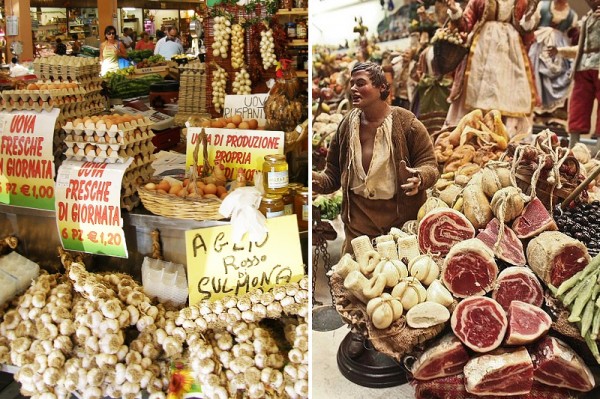Let’s start with the obvious. All you need to celebrate Italy are a few eggs, flour, and water. The result? Pasta dough [Recipe]. Italians make an art of rolling their pasta dough thin. In my family, my great grandmother covered her rough wooden table with an oil cloth, a heavy duty covering that refused to budge no matter how long and hard she rolled the dough. (I should mention she only used eggs and flour – making for a really stiff dough). Mom says the process went on for an hour – she rolled it until the sheet of pasta was the size of the table. Roll, slap. Roll, slap. Eventually it turned into homemade ravioli. Most of the time she made hers with ingredients such as spinach, and ricotta. Our distant cousin, Alfred, made his with pork chops, spinach, nutmeg, etc [Recipe].