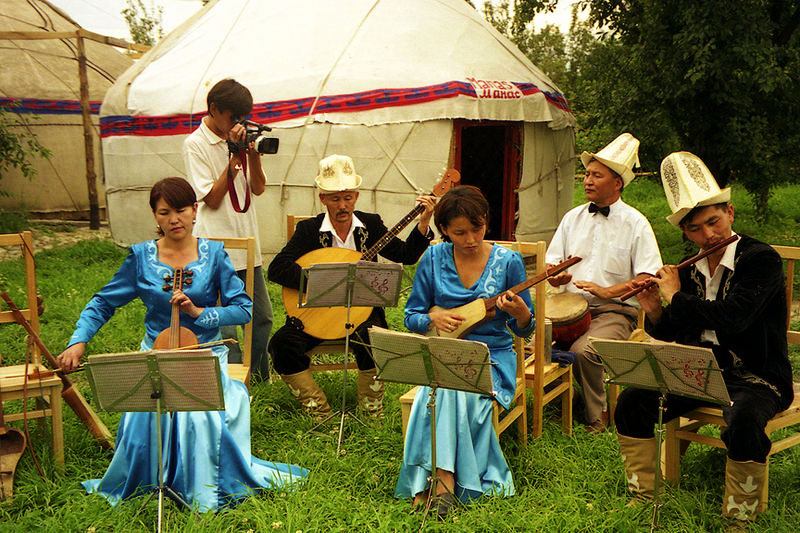 Musicians playing a selection of traditional Kyrgyz instruments, including komuz (stringed instrument in center foreground) and sybyzgy (transverse flute). Photo by Simon Garbutt.