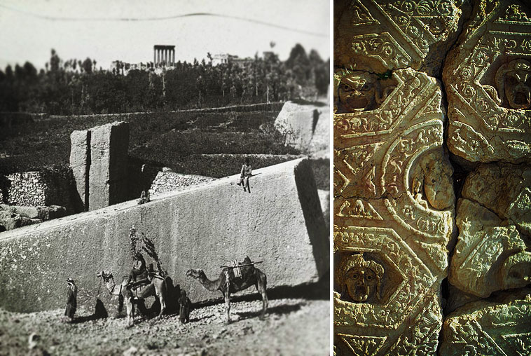 Stone of the Pregnant Woman. Photo from the Oregon State University Archives. Ornamental ceiling. Photo by Jerzy Strzelecki. Both images from Baalbek.