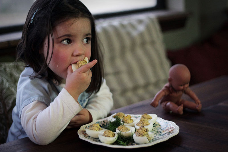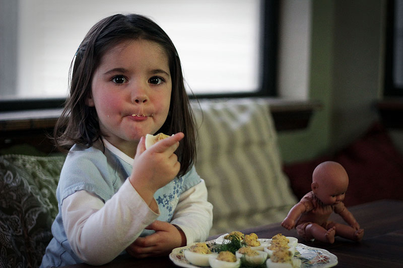 That’s right, folks. In the time it took me to beg Keith to eat two deviled eggs, Ava sampled one of every. single. egg. And then she put them all back, nice and neatly on the platter.