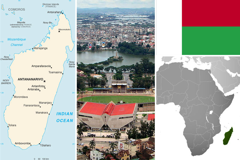 Maps and flag courtesy of CIA World Factbook. Photo of Antananarivo - Mahamasima Stadium and Anosy lake, Madagascar by ernard Gagnon