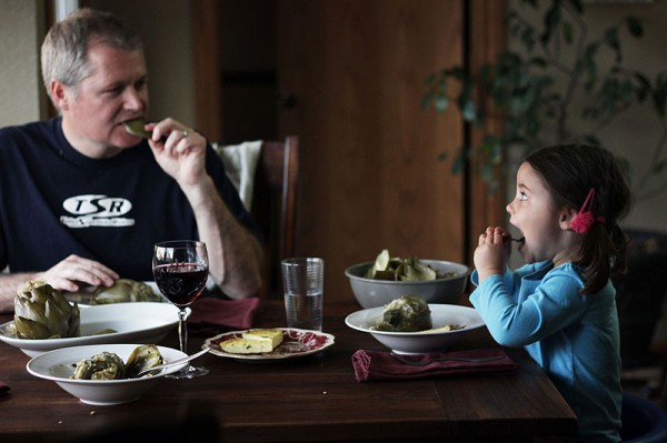 While I didn’t expect to enjoy this filling, I made myself try the anchovies by themselves. Turns out they taste like salty, oily fish. Not so bad, really. Once they were in the artichokes, I definitely couldn’t taste them, but was able to detect the way that they “amped up” the rest of the flavors. Ava ate a ton of hers, although went light on the stuffing, I think because it was crumbly.