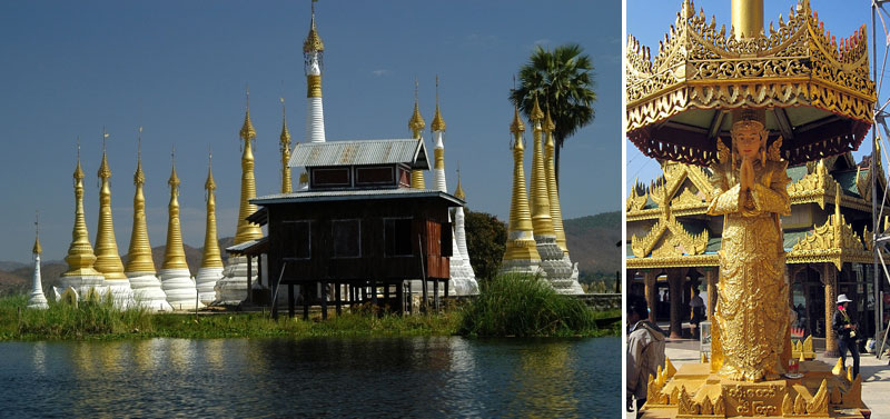 Inle Lake Monastery, photo by Bild von Stefan Grünig. Thagyamin statue at the Kyauktan Yay-Le Pagoda, photo by Hintha.