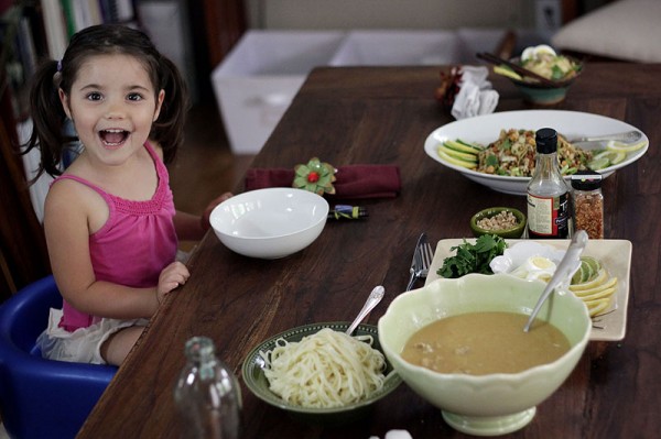 This is the kind of soup you cuddle up to after a busy day, when you are so hungry you can’t stand it. The coconut milk and nutritious chickpea flour create a smooth base for a slightly spicy chicken curry. The noodles soak everything up, including the half of a lime I squeezed on mine, tons of green onion, extra fish sauce and cilantro. Ava adored this and really went to town “building” her bowl.