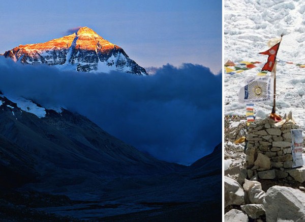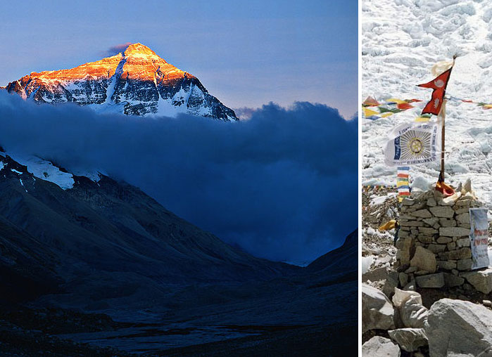 Mount Everest, photo by Bernard Goldbach. Stupa and prayer flags at basecamp, photo by Uwe Gille.