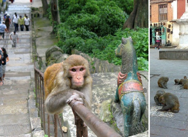 A Rhesus Macaque on Swayambhunath hill, Kathmandu Valley, Nepal . An ancient religious complex atop the hill in the Kathmandu Valley, west of Kathmandu city. It is also known as the Monkey Temple for the holy monkeys living in parts of the temple. Photo by Ester Inbar, available from http://commons.wikimedia.org/wiki/User:ST and monkeys in courtyard by Holynow.