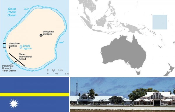 Maps & flag courtesy CIA World Factbook. Buildings are the government (left) & parliament (right) of Nauru. Photo by Porthos Bop