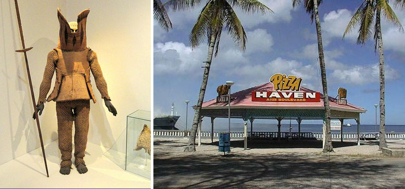 The old (warrior suit from 1891. Photo by Daderot) contrasted with the new (Pizza shop in Aiue Boulevard at Aiwo, Nauru. Photo by CdaMVvWgS)