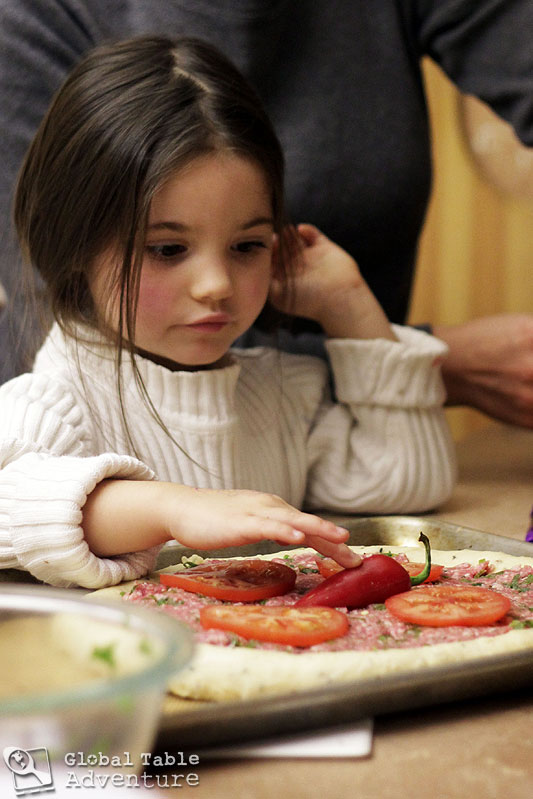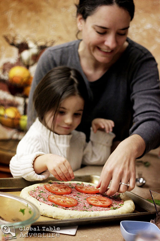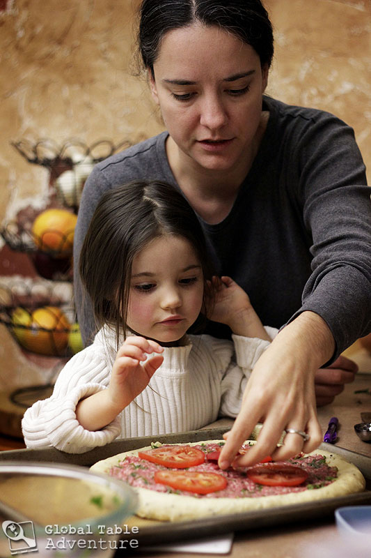 This pizza is really more of a flatbread with lamb topping; it was an unexpected crowd-pleaser. After lunch, I even found Mr Picky hunched over the pizza peel, sneaking leftovers in the kitchen. The simple bread is highly spiced in a completely addicting way, great with moist lamb and a hit of the tahini sauce. The overall flavor is reminiscent of spiced sausage.