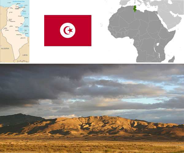 Maps and flag courtesy of CIA World Factbook. Photo of Landscape in Tozeur–Nefta International Airport (Tunisia), by Gloumouth1.