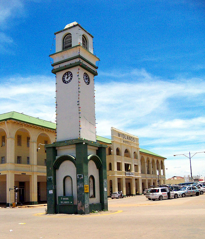The Boggie Clock in Gweru, Zimbabwe. In the background is the Midlands Hotel. Photo by Akumudzi.