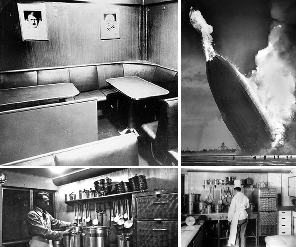Photos from the Hindeburg. Galley Kitchen plus seating for the crew (note the photo of Hitler and Hindenburg). Source. Photo of disaster from the Associated Press.