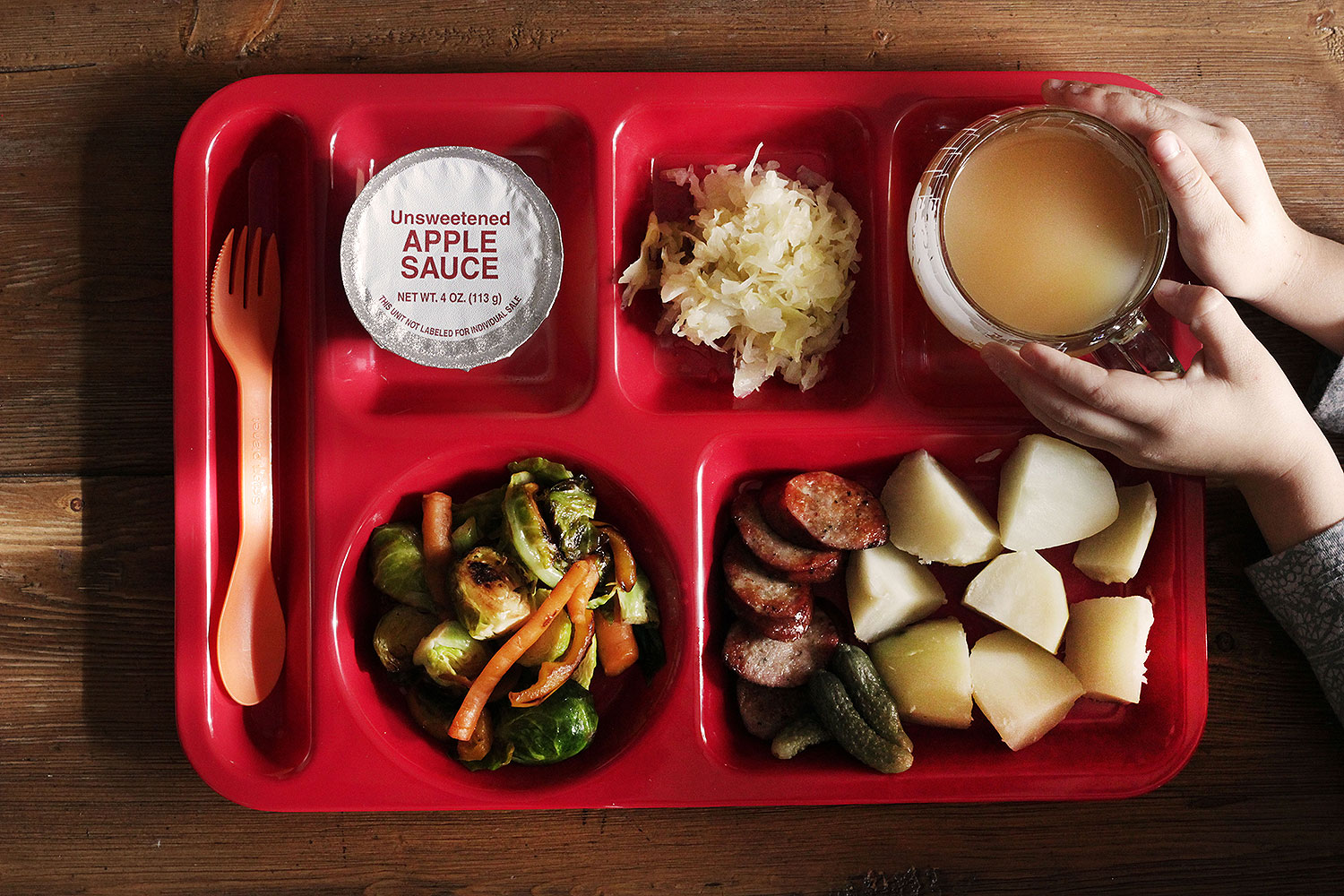 Whether your child is in a growth spurt or you just need a meal to satisfy you longer than the 20 minutes it takes to eat it, Polish comfort food is the answer. We ate ours back on December 23rd, three hours before locking up the house and flying to spend 11 days with more than a dozen family members (First stop: Cape Charles Virginia, to see one of my brothers and sisters, and their kids. Second stop: Martinsburg, West Viriginia for our cousin’s wedding and most of Keith’s family). In large part, this hurried meal was the kind of “cleaning out the fridge” and “pantry upkeep” situation I engage in every time I travel. It started because the potatoes threatened to grow legs and walk off while we were away. In the fridge, I had a link of kielbasa sausage and package of fresh sauerkraut with imminent expiration dates, plus some carrots and Brussels sprouts that I just knew would be despondent upon our return. I pan-fried the vegetables and sausage while the potatoes boiled. As the components came together on our trays …