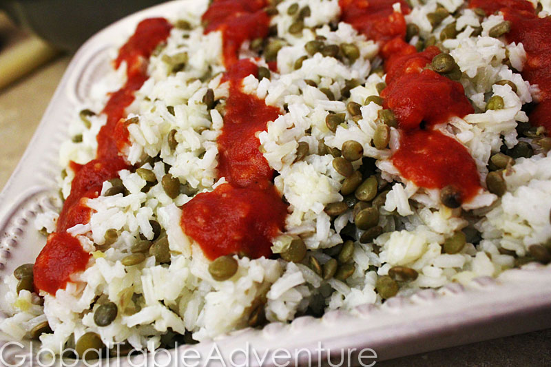 Serves 6 In Egypt, there are entire restaurants devoted soley to the production of Kushary. Giant vats are filled with the necessary ingredients and kept warm over low heat. With each order, a quick-moving server walks their ladle through the vats, filling the customer’s bowl up to the brim with pasta, rice, lentils, spicy tomato sauce, and fried onions. While it is difficult to reproduce this type of assembly at home, it is possible to layer all the ingredients in a casserole and keep warm. This is how we’ve approached this mega popular Egyptian dish. NOTE: If it seems a bit overwhelming, think about breaking this recipe up over a few days (make the pasta and sauce one day, the rice and lentils anther day…) just keep everything refrigerated until you’re ready to assemble. Ingredients: 1 cup dry macaroni 1/4 lb angel hair pasta, broken into 1-2″ pieces 1/8 cup olive oil 1 1/2 cups long grain rice 1/2 cup dry lentils Garnish: 1-2 onions, sliced thinly and pan-fried in olive oil 1 batch Spicy Egyptian …