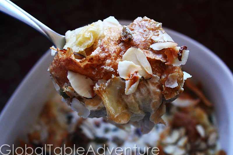 Serves 6 Egyptians have been eating Um Ali for hundreds of years. Clifford A. Wright tells the story well: One day while hunting in the Nile delta, the sultan developed a ravenous appetite and stopped in a small village. The peasants wished to please the sultan, so the best cook of the village, Umm Ali, pulled out a special pan and filled it with the only ingredients she had around: some dried wheat flakes, sultanas [raisins], nuts, and coconut. She covered it with sugar and milk and put it in the village’s oven. Excerpt from A Mediterranean Feast As simple as can be, this sweet, milky blend of pastry, nuts, raisins, and coconut flakes will be a distinct addition to your Egyptian Global Table. Ingredients: 1 sheet of puff pastry, baked 1/4 cup almonds 1/4 cup raisins 1/4 cup coconut chips (or 1/8 cup shredded coconut) 1/8 cup sugar 1 cup whole milk 1 cup half and half Method: Bake the puff pastry according to package directions. It will turn into a giant, greasy pillow. Try not …