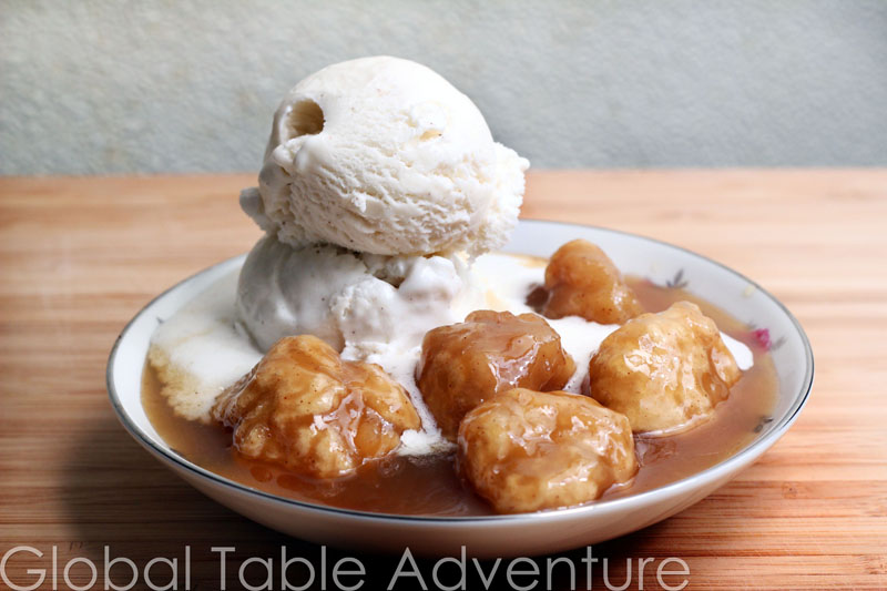 Serves 4 Hot, sweet, syrupy Grandpères served with two scoops of cold vanilla ice cream. Genius. And we have generations of Canadians to thank for keeping this age-old recipe alive. You can eat this for breakfast or dessert. Or a midnight snack. Ingredients: For the dumplings: 2 – 2 1/4 cups flour 1 Tbsp baking powder 1/2 tsp cinnamon pinch of salt 3 Tbsp butter 3/4 cup whole milk For the cooking liquid: 2 cups maple syrup 1 1/2 cups water Method: In a large bowl, mix together flour… … start with two cups and add more if you need to. Stir in the baking powder… A scoop of cinnamon (or Sin as my mom likes to call it) Whisk together with a pinch of salt. Can you see Keith? Now add some buttery goodness. Cut it into the flour with a pastry cutter. Stop when the butter is pea-sized. Next comes the milk. Mix it together until it forms a loose mass, like wet bread dough. Add water to a pot… make it a …